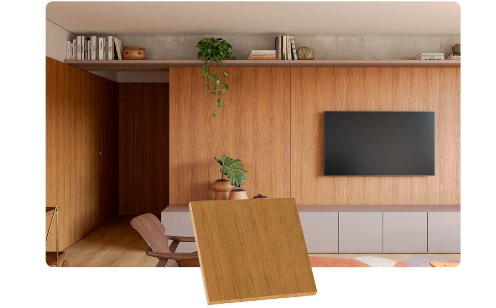 Seu tom quente valoriza ambientes, agrega sofisticação ao móvel e amplia a percepção de valor do projeto final.